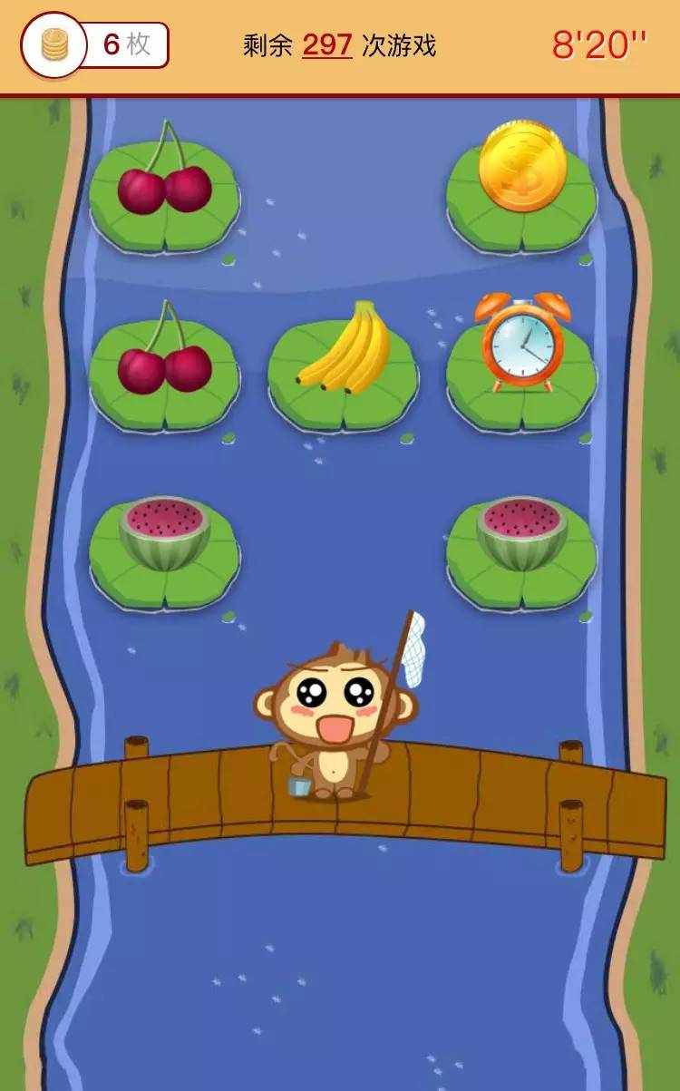 開始游戲后,將在河流向“猴子”方向飄來水果、金幣、鬧鐘三類物品。請手指點擊想撈的物品方向所對的橋面位置,“猴子”會自動跑過去撈取它前面的物品。