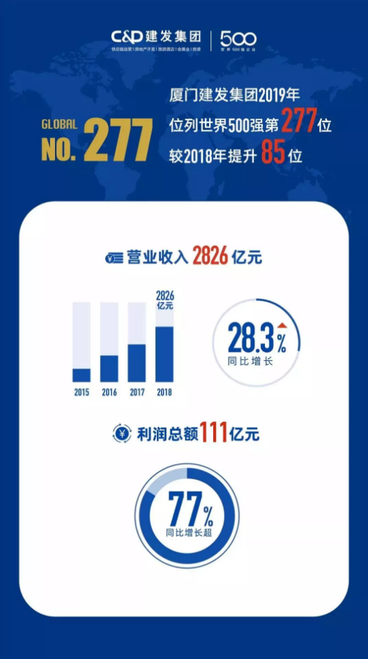 北京時(shí)間7月22日,《財(cái)富》雜志發(fā)布2019世界500強(qiáng)榜單,建發(fā)集團(tuán)躍居第277位,較2018年上升85位。排名背后,是不斷提升的運(yùn)營(yíng)效率和經(jīng)營(yíng)質(zhì)量。2018年,建發(fā)集團(tuán)實(shí)現(xiàn)營(yíng)業(yè)收入2826億元,同比增長(zhǎng)28.3%;利潤(rùn)總額111億元,同比增長(zhǎng)超過77%。
