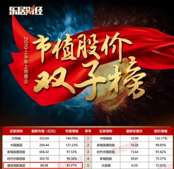 在這份榜單排名中,建發(fā)房產(chǎn)控股的香港上市公司建發(fā)國際(HK.01908)最新市值為88.98億港元,市值增幅達(dá)81.27%,排名第五位;最新股價為9.78港元,股價增幅46.41%,排名第17位。榜單發(fā)布后即遭火爆轉(zhuǎn)載,格隆匯發(fā)布的《2019上半年上市房企市值股價雙子榜:建發(fā)國際(1908.HK)市值增幅排名第五》累計閱讀量已超22萬次!