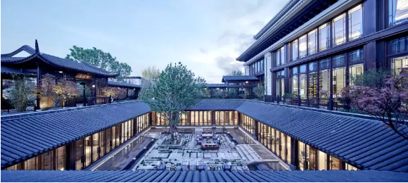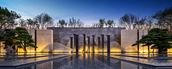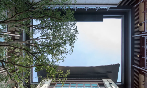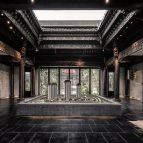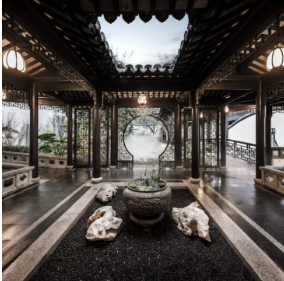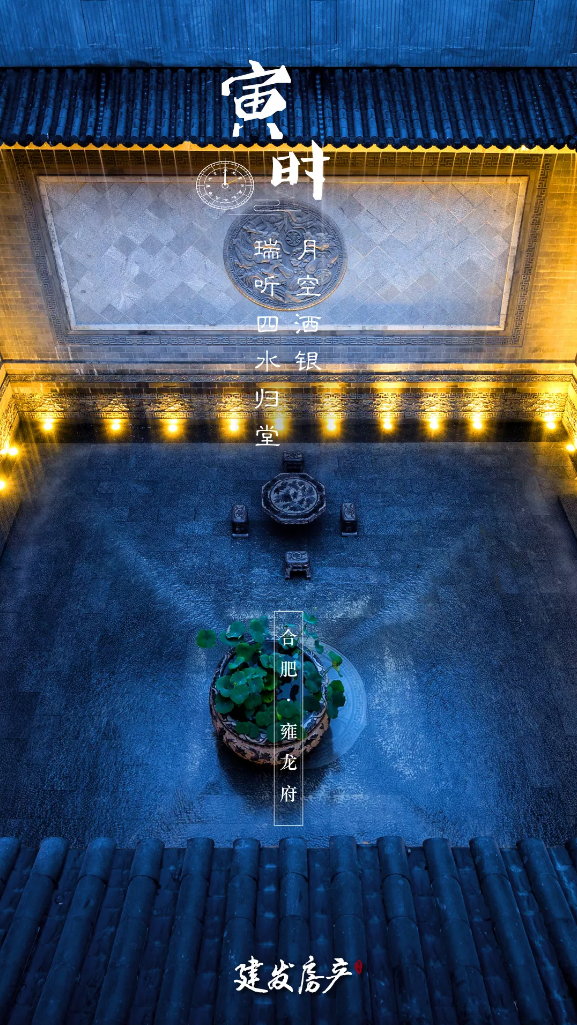 因為圍合,中式建筑才有了向心的力量。合肥雍龍府,擁有建發(fā)房產(chǎn)首個實景展示的四水歸堂。晴時陽光自天井瀉入堂前,如同“灑金”;雨時雨水從四面落入天井,恍若“流銀”,寓意水聚天心、天人合一。