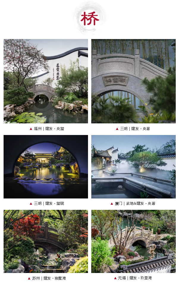 唐代,人們在灞橋上設(shè)立驛站,凡送別親人好友東去,大多都要送到灞橋后才分手,并折下岸邊柳枝相贈。建發(fā)房產(chǎn)的中式產(chǎn)品,廣泛運用了拱橋、折橋等形式。太倉泱著的橋,展現(xiàn)了小橋流水、蜿蜒曲折的江南建筑美感。