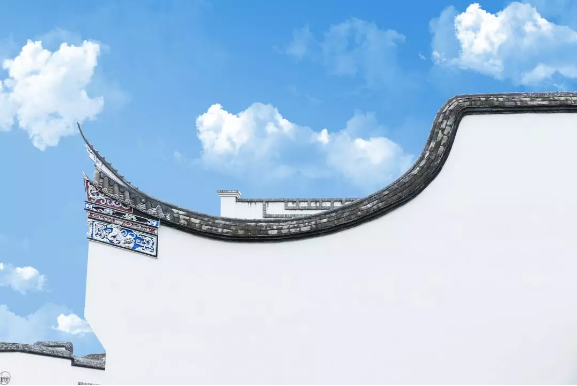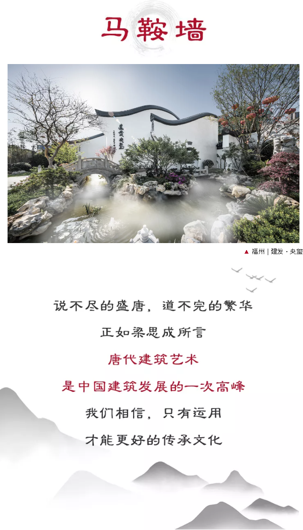 福州央璽的馬鞍墻,墻體形成馬鞍狀流線,墻頭瓦片累疊,脊頂青灰抹平,造型豐富,自由舒展。