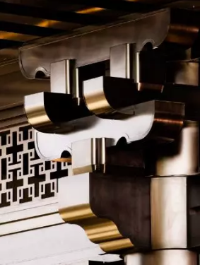 唐代孔穎達(dá)說:“山節(jié),謂刻柱頭為斗栱,形如山也。” 有唐一代,斗栱碩大,屋檐深遠(yuǎn),盛唐雄渾的建筑氣象就此定格。廈門璽樾的斗栱韻味十足,盡錯綜之美,顯技巧之變。