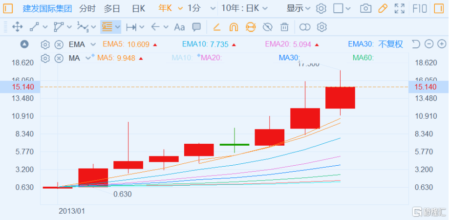 既然是最具投資價值的企業(yè),必然不能拘泥于短期的表現(xiàn),拉長時間線來看,建發(fā)國際的年K線圖尤為驚艷,上市至今股價連年走高。